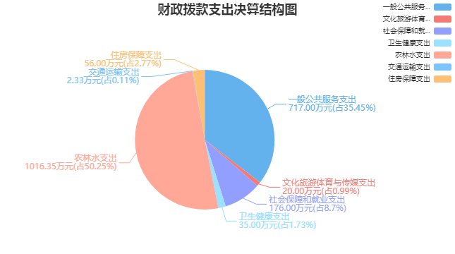 2022年度一般公共预算财政拨款支出2,022.68万元,主要用于以下方面:一般公共服务(类)支出717万元,占35.45%;文化旅游体育与传媒(类)支出20万元,占0.99%;社会保障和就业(类)支出176万元,占8.7%;卫生健康(类)支出35万元,占1.73%;农林水(类)支出1,016.35万元,占50.25%;交通运输(类)支出2.33万元,占0.11%;住房保障(类)支出56万元,占2.77%。