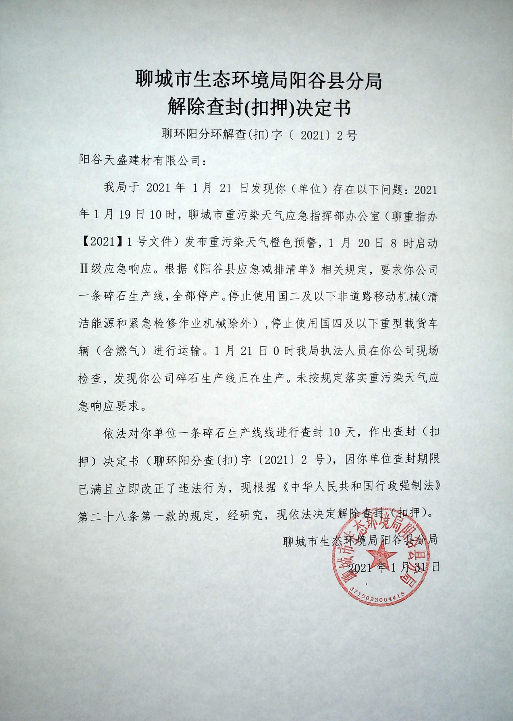 解除查封(扣押)决定书 阳谷天盛建材有限公司