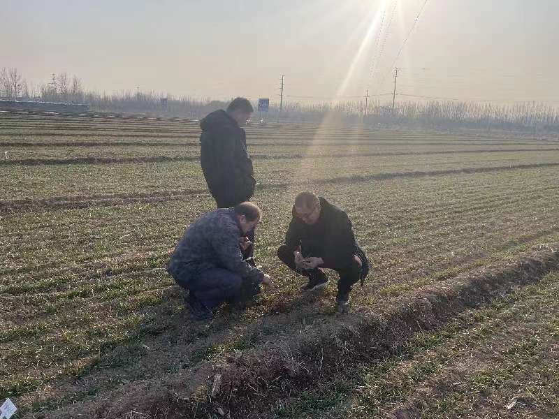 考察后,宿振起教授代表服务团总结小麦生产存在问题:“冬前和冬季,良种繁育基地土壤墒情适宜,苗情总体较好,但是还存在一些问题:一是去年早播、晚播两极分化,田间旺苗、弱苗仍有一定面积,苗情相对较为复杂;二是病虫草害隐患较大,土传病害呈加重趋势,秸秆未充分腐熟、土壤中病菌连年积累数量多,有利于土传病害侵染危害,春季麦田杂草防控压力大;三是历年春季气象多变,急剧降温天气频发,小麦生产仍面临倒春寒威胁。”