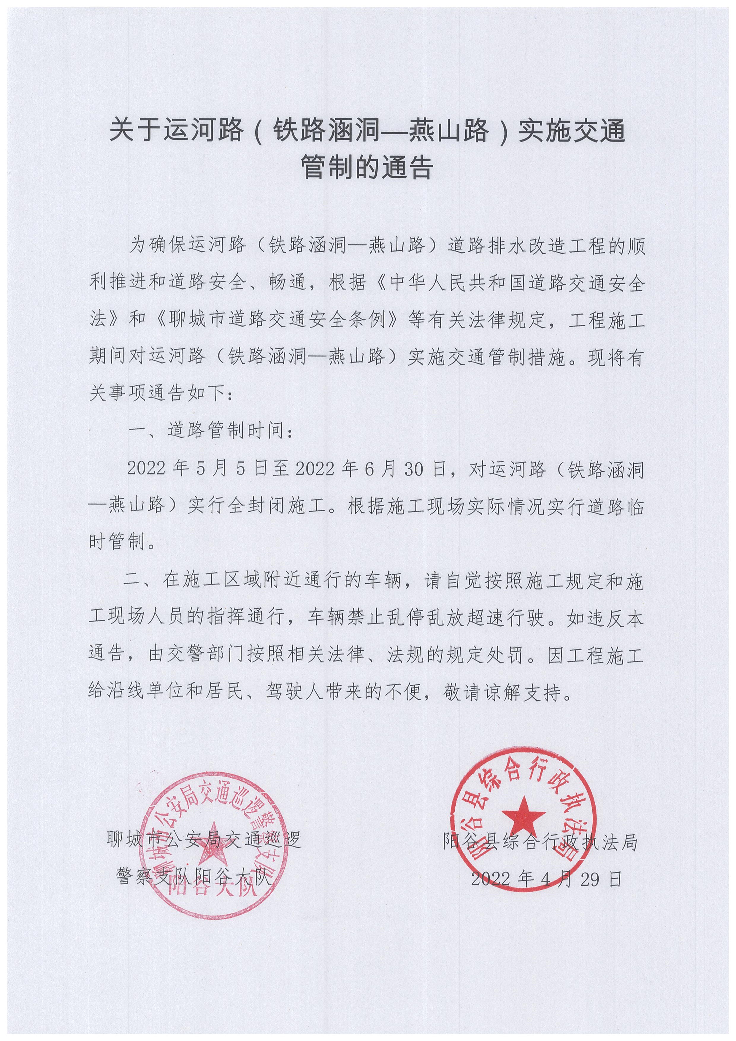关于运河路(铁路涵洞—燕山路)实施交通管制的通告