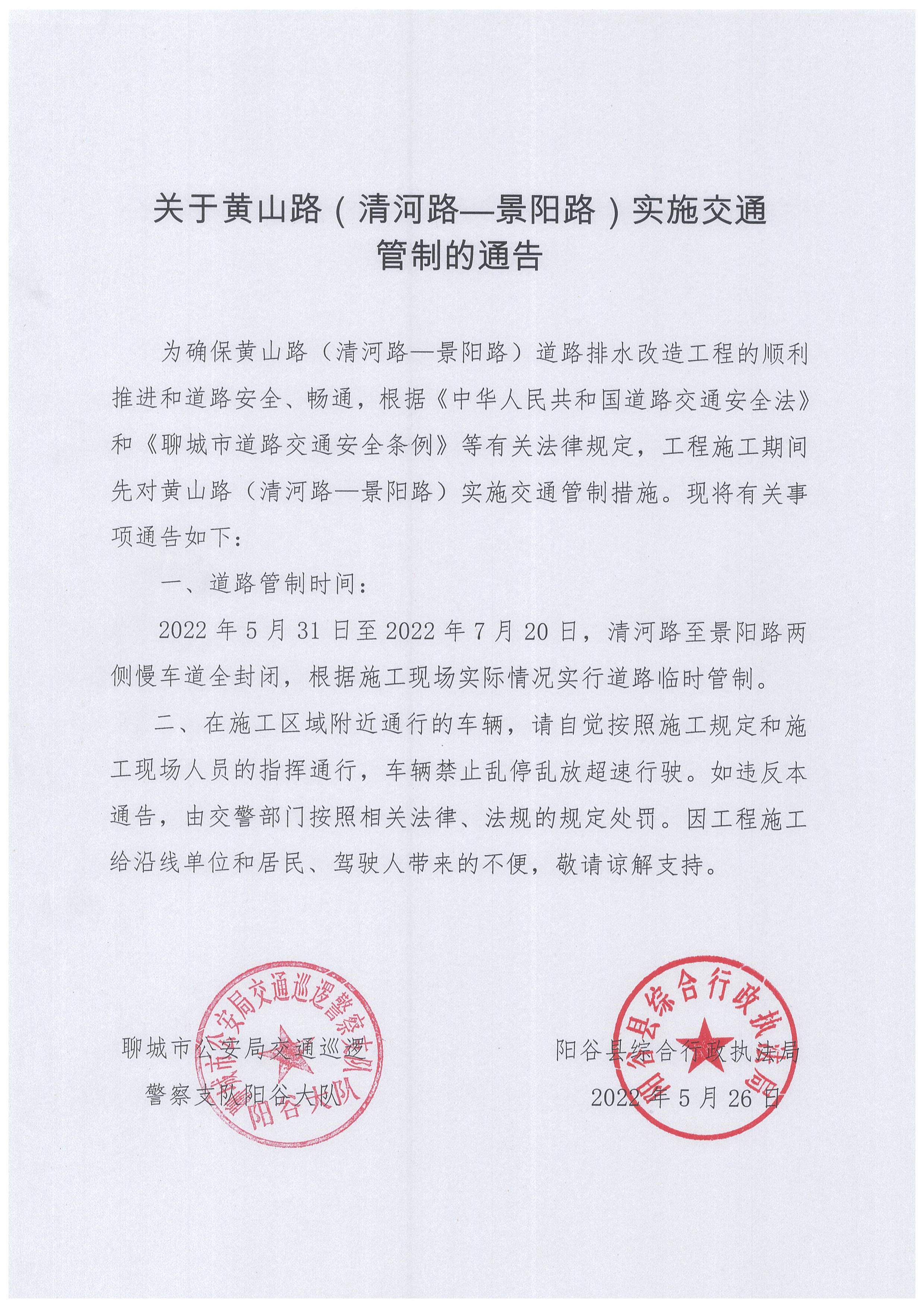 关于黄山路(清河路—景阳路)实施交通管制的通告