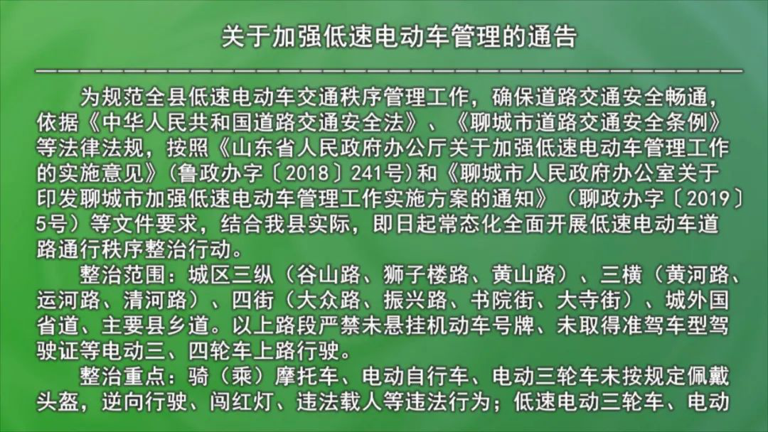 为规范阳谷县低速电动车交通秩序管理工作,确保道路交通安全畅通,依据《中华人民共和国道路交通安全法》、《聊城市道路交通安全条例》等法律法规,按照《山东省人民政府办公厅关于加强低速电动车管理工作的实施意见》(鲁政办字〔2018〕241号)和《聊城市人民政府办公室关于印发聊城市加强低速电动车管理工作实施方案的通知》(聊政办字〔2019〕5号)等文件要求,结合我县实际,即日起常态化全面开展低速电动车道路通行秩序整治行动。
