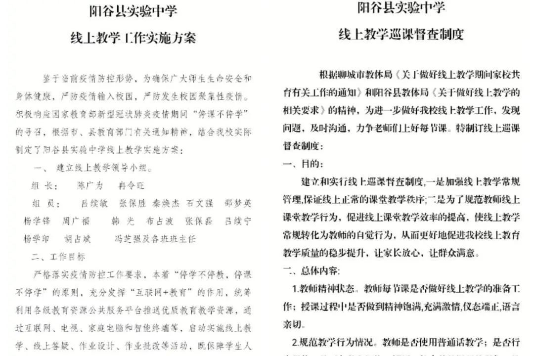 学校统筹安排线上教学。结合本校校情、学情实际,认真制定《阳谷县实验中学线上教学实施方案》,细化《线上教学作息时间表》《线上教学课程表》等。学校在开设常规的学科课程外的同时,还精心设置了心理健康、疫情防控、劳动技能等课程。